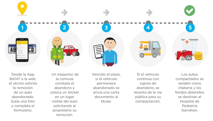 Los autos compactados se venden como chatarra y los fondos obtenidos se destinan al Hospital de Pediatría Garrahan. Durante 2018 la Ciudad removió 1658 autos abandonados, casi 7 por día, más de la mitad de esas remociones fueron solicitadas por vecinos a través de la aplicación BA 147. Los vehículos son removidos por el Programa de Descontaminación, Compactación y Disposición Final de Automotores (PRO.COM) que cuenta con una playa para tal fin, en todos los casos los titulares al menos recibieron dos intimaciones. Desde que comenzó se compactaron más de 10.000 autos y se aportaron más de 4 millones de pesos a la Fundación del Hospital Garrahan.