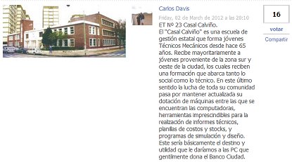 El Banco Ciudad suele renovar su parque tecnológico cada dos años aproximadamente, donando las máquinas que son reemplazadas (PC con apenas un par de años de antigüedad) a instituciones públicas. Gracias a la participación de los vecinos en el año 2010 la Esc. Nº 2 del DE 11 recibió 14 computadoras para sus aulas. En este caso elegimos a una institución técnica de la zona que desde hace 65 años viene formando a jóvenes del barrio como Técnicos Mecánicos. La escuela es la Técnica Nº 23 "Casal Calviño" ubicada en Lacarra 621. El procedimiento para votar Es sumamente sencillo, la única condición es ser usuarios de Facebook. A través de este link accedemos a una página en la que aparece una foto de la escuela con una descripción breve de algunas de las actividades que en ella se desarrollan...