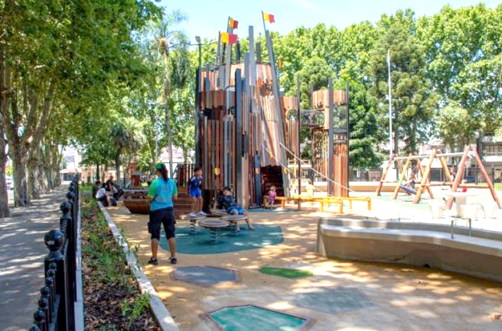 Vale mencionar que este año la Ciudad está llevando adelante un plan de renovación de nada menos que 104 espacios verdes, incluidos más de 30 proyectos de puesta en valor y renovación de patios de juegos, para que los niños, independientemente de sus necesidades y aptitudes, puedan jugar y compartir. La plaza Olivera es una manzana que se encuentra dividida en dos “triángulos” por la traza de la Avenida Olivera. El patio de juegos está ubicado sobre uno de los dos triángulos que conforman la plaza. Su diseño temático estuvo inspirado en la historia: el barrio Parque Avellaneda se ubica en lo que fuera la antigua chacra "Los Remedios", que perteneció a la familia de don Domingo Olivera. El estilo medieval se eligió al encontrar vínculos entre la familia Olivera, que da nombre a la plaza, con aquel período histórico, en Europa. Con esa idea, se proyectó un mangrullo original de grandes dimensiones con forma de castillo medieval, fabricado en madera y hierro. El área de juegos fue ampliada y organizada pensando en dos sectores: uno más tranquilo, con arenero y solados (pisos suaves de caucho) con texturas y colores estimulantes para los más chicos; y otro sector más dinámico, con juegos de destreza y agilidad para niños más grandes. La zona de juegos también incluye un pórtico de hamacas. Una de las particularidades del espacio es el tabique perimetral con vegetación nativa, que funciona como separación visual y efectiva respecto de la avenida y, al mismo tiempo, integra el patio con el entorno verde. Esta delimitación acompaña la silueta del espacio de juego y colabora en generar un ambiente seguro y contenido. La reciente renovación del patio de juegos formó parte de una reforma integral de la Plaza Olivera, que incluyó nuevos sectores de estar y mobiliario urbano. Para mejorar la circulación y la accesibilidad, se modificaron también los caminos, al reemplazarse parte de la superficie de granza por hormigón peinado, con césped a los costados y una nueva propuesta paisajística para no afectar la superficie absorbente.