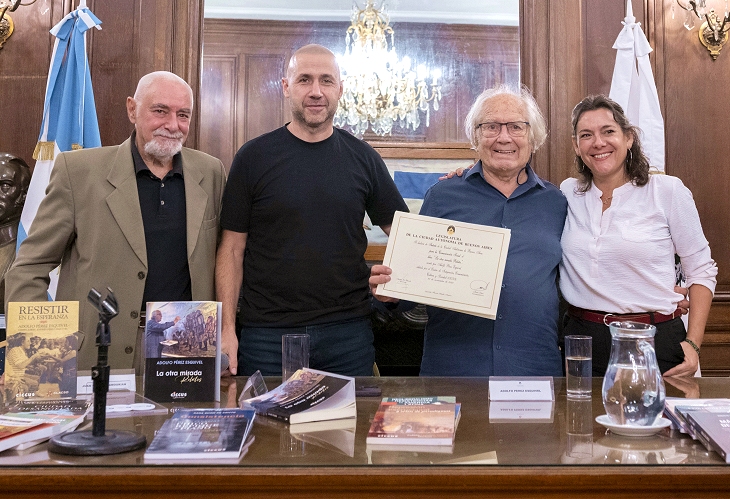 Andrés La Blunda abrió el encuentro indicando que: “Es importante reconocer un libro como el de Adofo en estos momentos en los que está en marcha un proyecto de destrucción. Hay otro lugar distinto del odio y la violencia que se quiere imponer hoy. Sus relatos hablan de ese lugar. Porque el amor sin fuerza es debilidad y la fuerza sin amor es brutalidad, como él mismo lo dice". “La otra mirada. Relatos” reúne textos y memorias que recorren la vida cotidiana, las luchas por los derechos humanos y las experiencias de pueblos y comunidades atravesadas por la injusticia. El libro invita a mirar la historia desde el lugar de quienes sufren la injusticia, pero también desde la esperanza y la dignidad de quienes resisten. Cada relato está ilustrado por dibujos realizados por él mismo. Constituyen en sí un testimonio vivo de una de las figuras más importantes de la Argentina. Por su parte, Adolfo Pérez Esquivel agradeció la distinción a su nuevo libro y destacó que su labor siempre se ha desarrollado junto a los miles de personas que mantienen el compromiso por el trabajo en DDHH alrededor del mundo. "Nadie puede ser feliz a solas. Nadie puede cambiar nada a solas. Tenemos que compartir el pan que alimenta el cuerpo y el espíritu. Tenemos que luchar por la libertad porque sin libertad no hay capacidad de amar. El tiempo que me queda, aunque sea un minuto, es la eternidad". Teresa Laborde Calvo, activa militante y defensora de los DDHH, cuya vida está marcada por la resistencia. Es sobreviviente de la última dictadura cívico-militar, su historia cobró masividad al ser retratada en la película Argentina "La nena que nace en el Falcon" de 1985. Teresa es hija de Adriana Calvo y Miguel Laborde, primeros testigos del Juicio a las Juntas. Ella expresó que: "Con este libro me llevaste a viajar por distintas latitudes y por el tiempo. Cada relato es un aprendizaje. No hay manera de que si el otro sufre no te afecte. Si nos acostumbramos a las injusticias vamos a vivir oprimidos". Juan Carlos "Coco" Manoukian, empresario nacional y activista social, político y gremial de amplia trayectoria en el ámbito cultural y educativo. Socio fundador y Presidente de la Fundación Centro de Integración, Comunicación, Cultura y Sociedad (CICCUS), organización de la sociedad civil con más de treinta años de trabajo en la producción editorial y la promoción de la lectura, dijo: "Adolfo Pérez Esquivel es un hombre de la cultura, artista plástico, escultor, escrito. Cruza los DDHH y la cultura de nuestro pueblo, porque la cultura es la política de los pueblos. Por eso, los que tienen privilegios desacreditan la política". Adolfo Pérez Esquivel (1931) es vecino de nuestro barrio de San Telmo, nacido y criado en una de las esquinas más emblemáticas del Casco Histórico porteño: Defensa y Humberto Primo. Estudió en la Universidad Nacional de La Plata, en la cual desarrolló una carrera artística como pintor y escultor. Enrolado en la Teología de la Liberación, una corriente teológica al interior de la Iglesia Católica, en 1974 fue designado Coordinador General del Servicio Paz y Justicia (SERPAJ) para Latinoamérica, institución que promueve los derechos humanos en la región desde la perspectiva teórica de la no violencia. A partir de la última Dictadura Cívico-Militar que se impuso luego del golpe de Estado de 1976, el SERPAJ fue una de las organizaciones que denunció internacionalmente los crímenes de lesa humanidad cometidos por las sucesivas Juntas Militares que ejercieron el Gobierno hasta 1983. Fue parte de la fundación de la Asamblea Permanente por los Derechos Humanos (APDH) y acompañó a muchos organismos de Derechos Humanos como Madres de Plaza de Mayo,Abuelas de Plaza de Mayo y Familiares de Detenidos y Desaparecidos por Razones Políticas. Toda esta militancia le valió el Premio Nobel de la Paz en 1980. Ha sido galardonado como Doctor Honoris causa en casi 20 universidades de Sudamérica, Norteamérica, Europa y Asia. Sus obras escultóricas manifiestan un enorme compromiso social, entre ellas: “El Vía Crucis Latinoamericano”; “Paño Cuaresmal”; el “Monumento a los refugiados”; el“Mural de los Pueblos Latinoamericanos” dedicado a los pueblos indígenas americanos. En el pueblo de sus ancestros, Combarro (España), inauguró un Parque de la Memoria con sus estatuas de su autoría. |